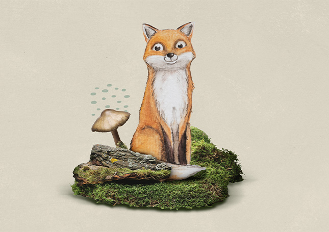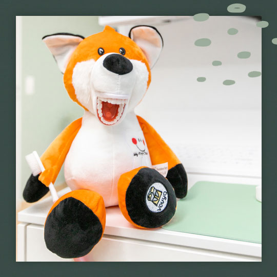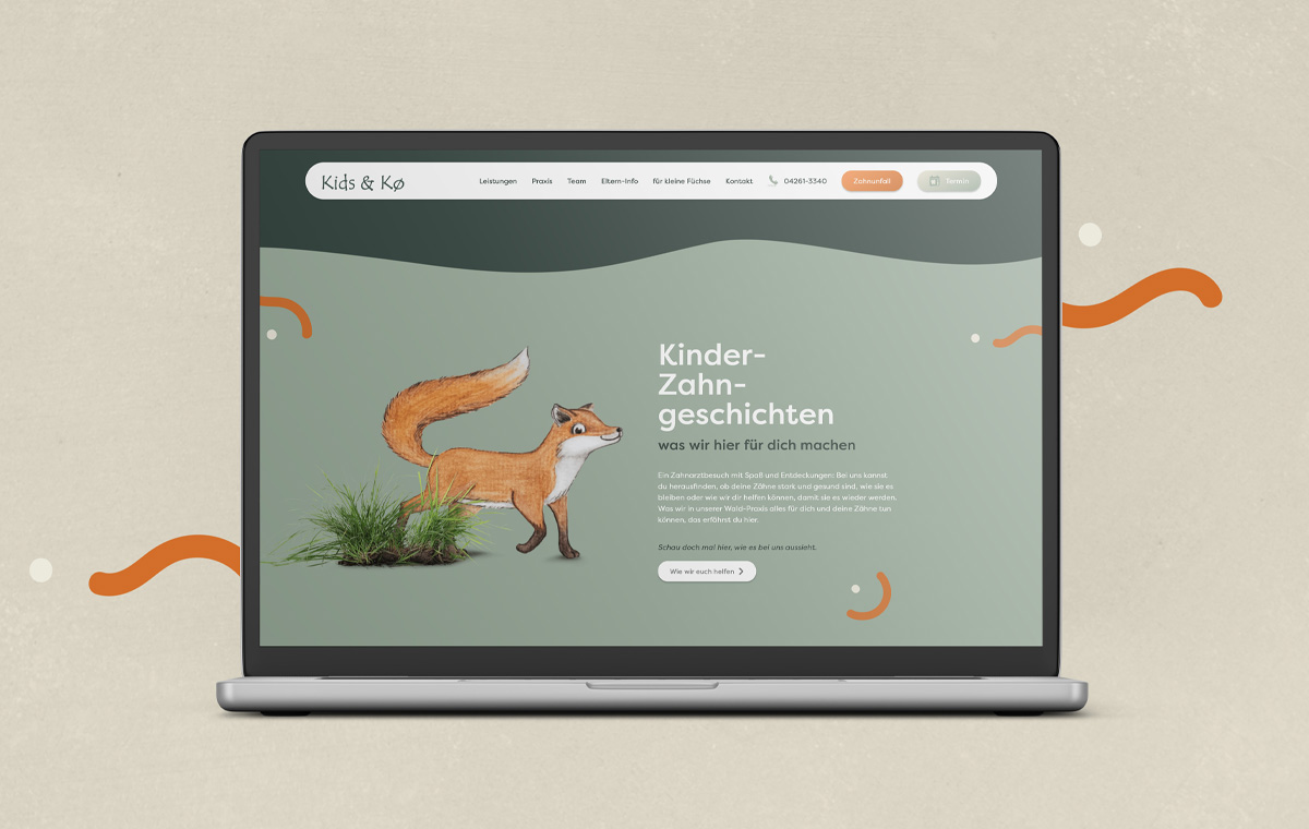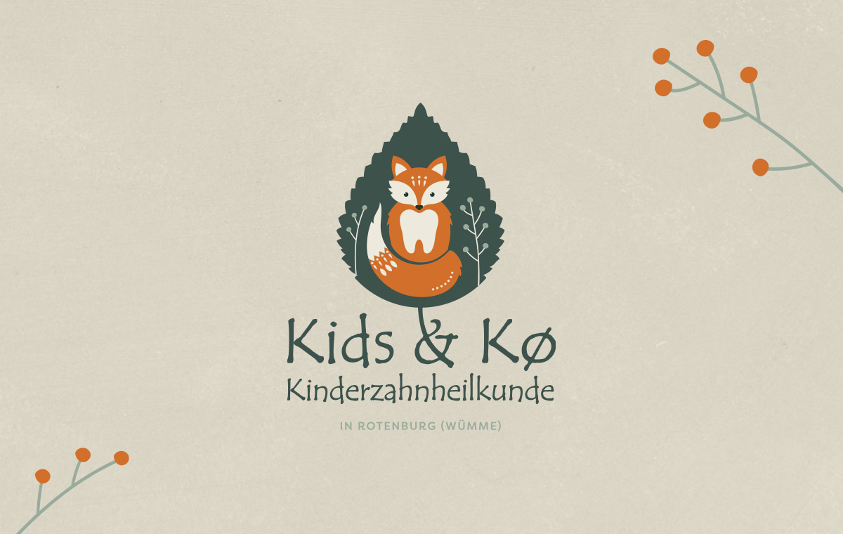 Ein illustrierter, süßer Fuchs begrüßt kleine und große Gäste, wenn sie die Website von Kids & Kø besuchen und wenn sie die Kinderzahnheilkunde-Praxis in Rotenburg (Wümme) betreten.