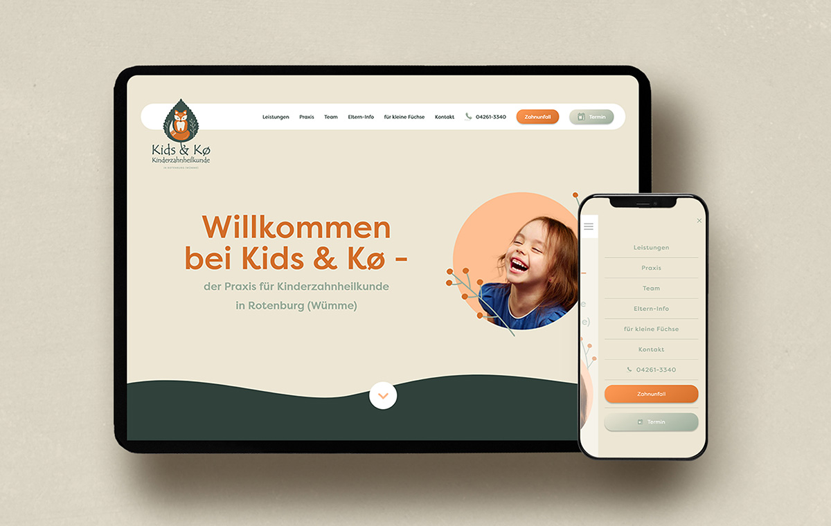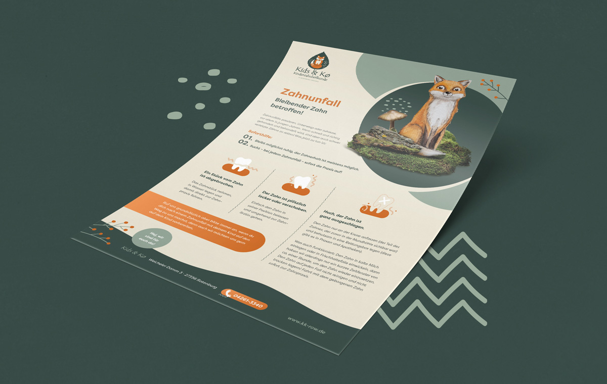 Wir durften ihren „Praxiswald“ von Anfang an mitgestalten – analog wie digital. Angefangen beim Logo, Corporate Design und dem passenden Wording über die Website bis zu Print-Produkten und weiteren kleinen Waldbewohnern, die nun neben Frida Fuchs die Praxisräume „bewohnen“ – und den Zahnarztbesuch zu einem echten Waldabenteuer machen.